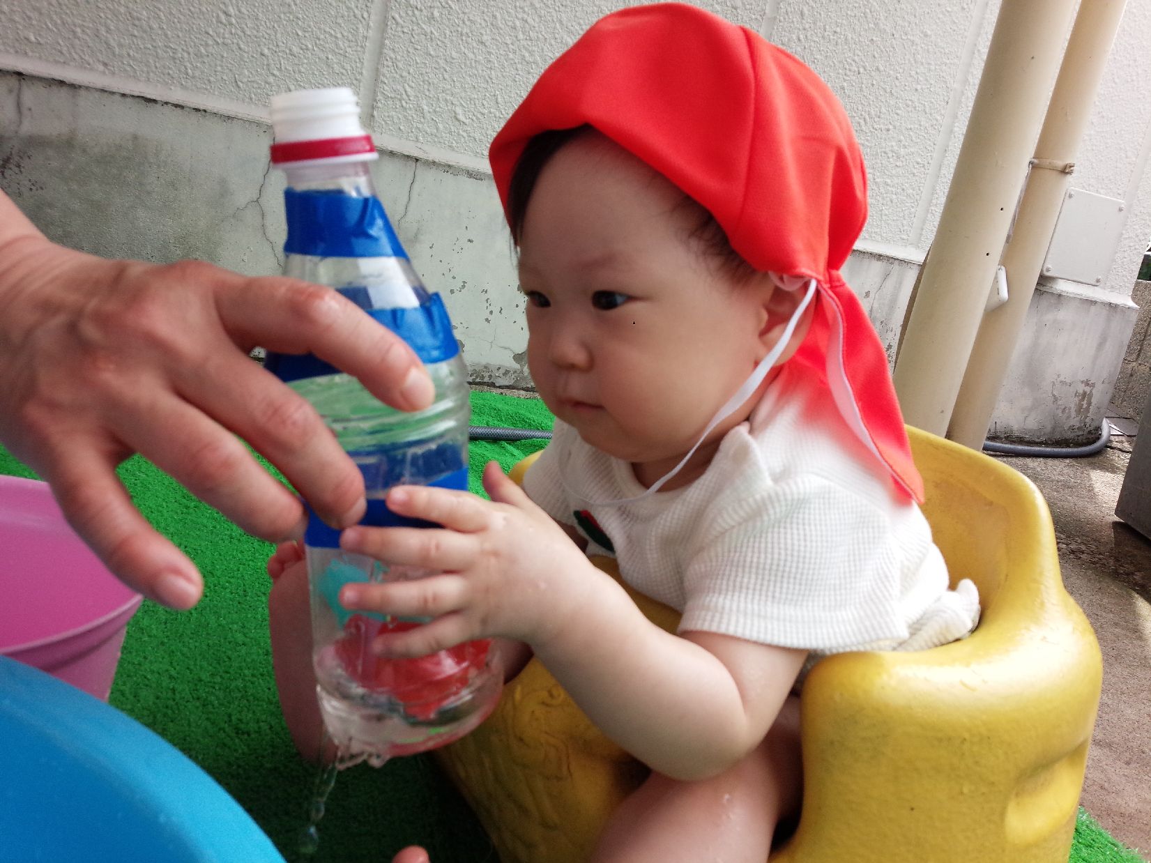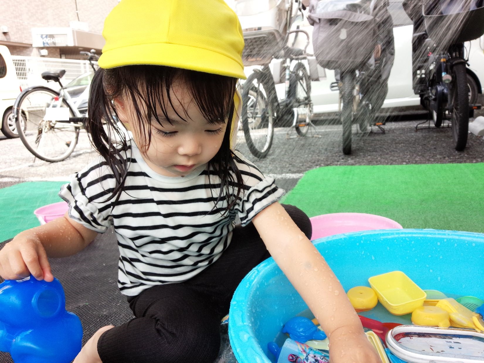 「帽子を被ろう!」とみんなに伝えると、その後はお水遊びだと分かっていて