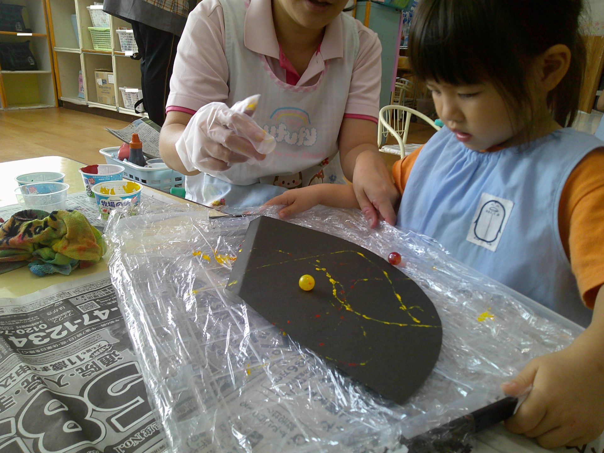 ビー玉を転がして模様をつけました(*^-^*)みんな真剣にやっています!