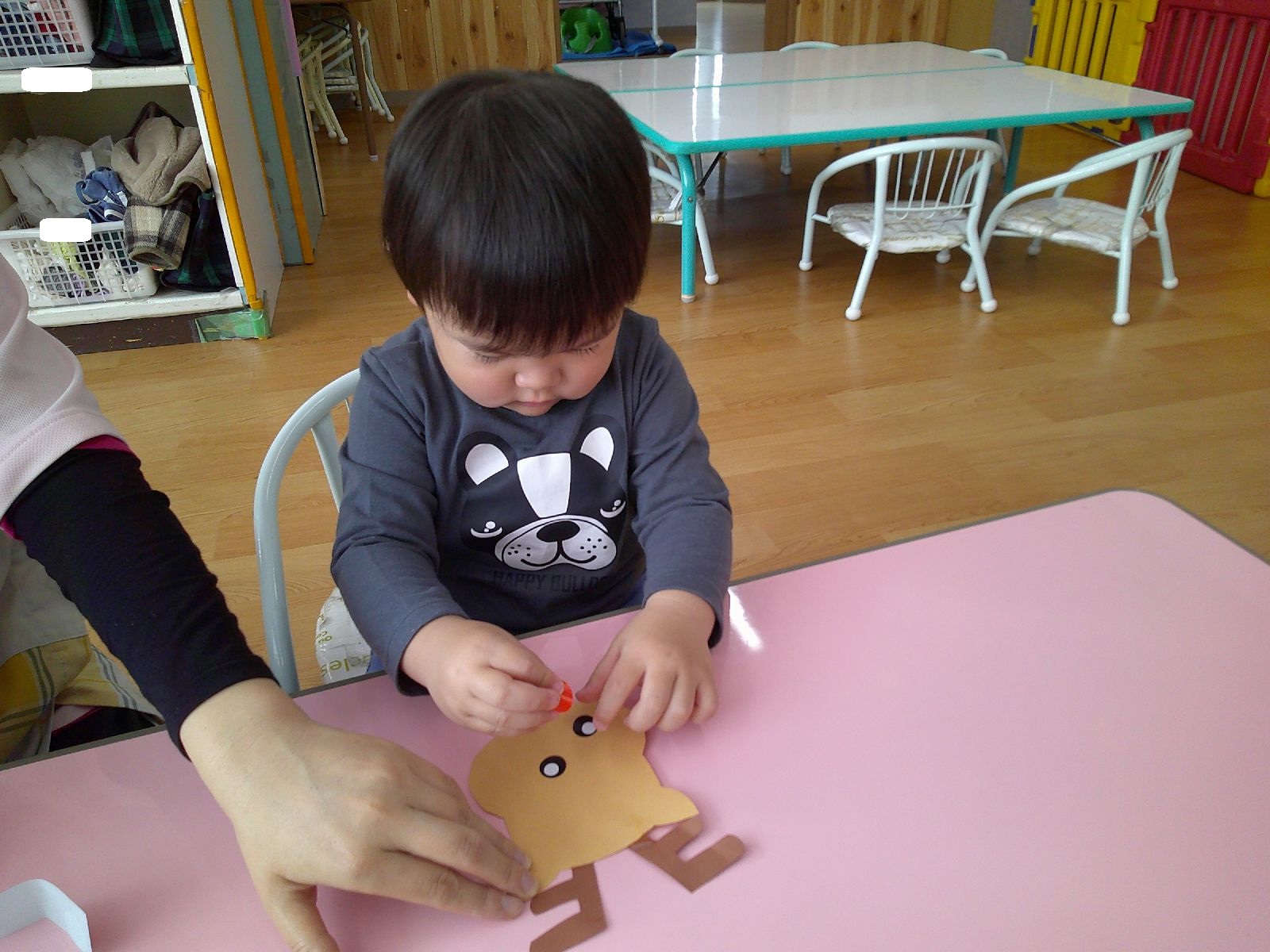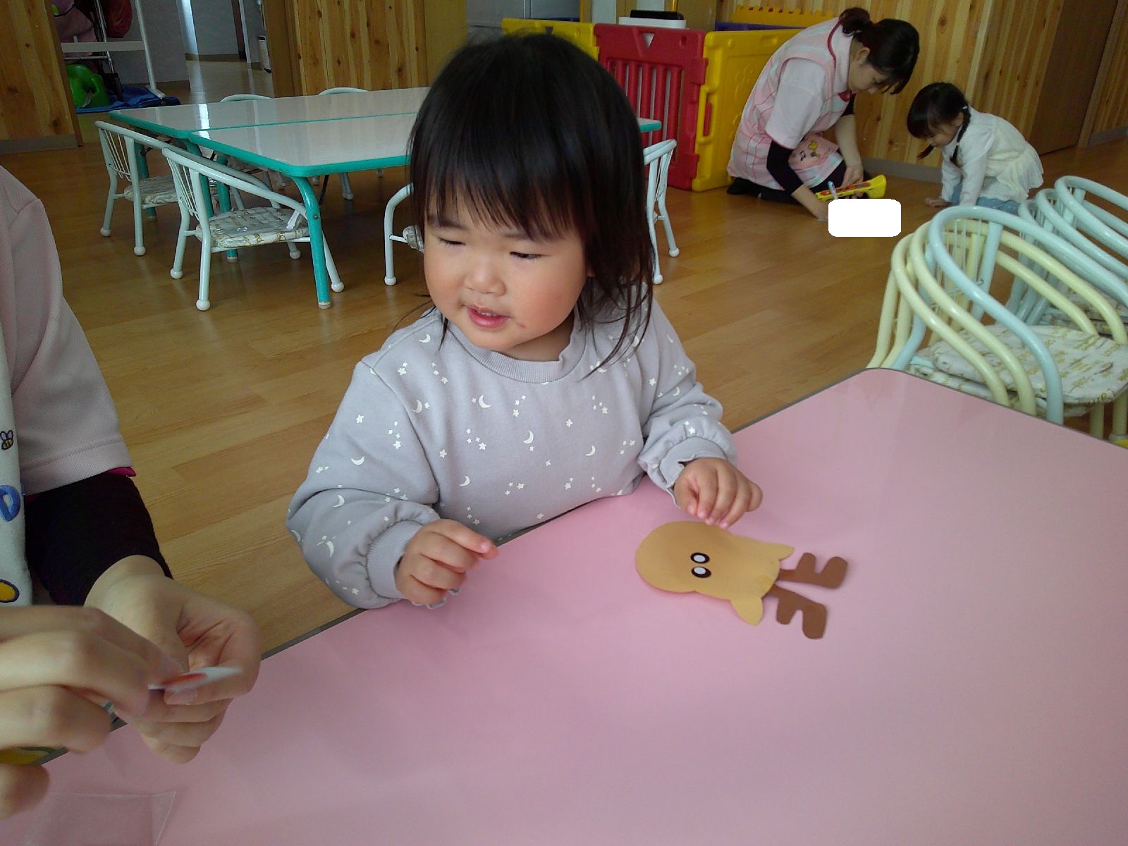 トナカイに目や赤い鼻をシールで貼りつけをし、みんなそれぞれのトナカイさんが出来ました✨