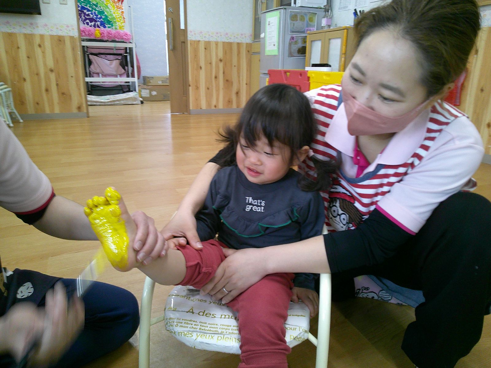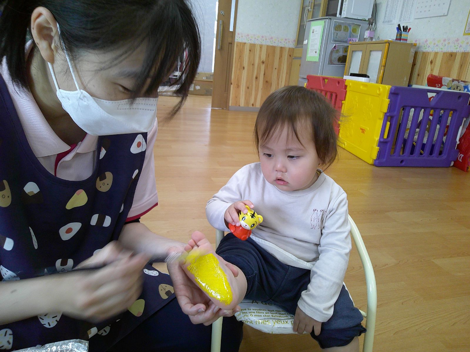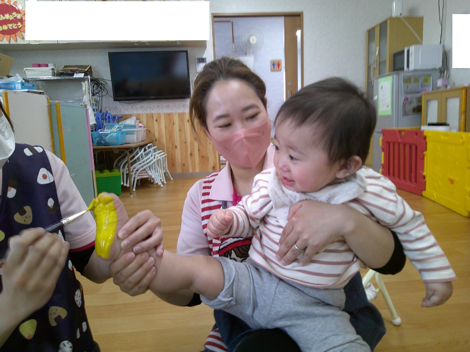 絵の具を足の裏に塗って、足型をとりました👣びっくりして涙するお友だちもいましたが、ニコニコ楽しむお友だちもいました☺少しずつ色々な事に挑戦していきたいと思います♡
