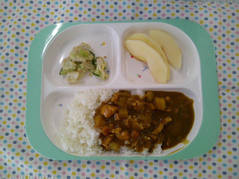 チキンカレー・キャベツとしらすのサラダ・りんご