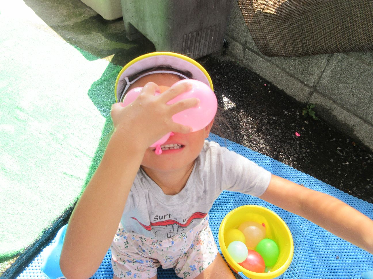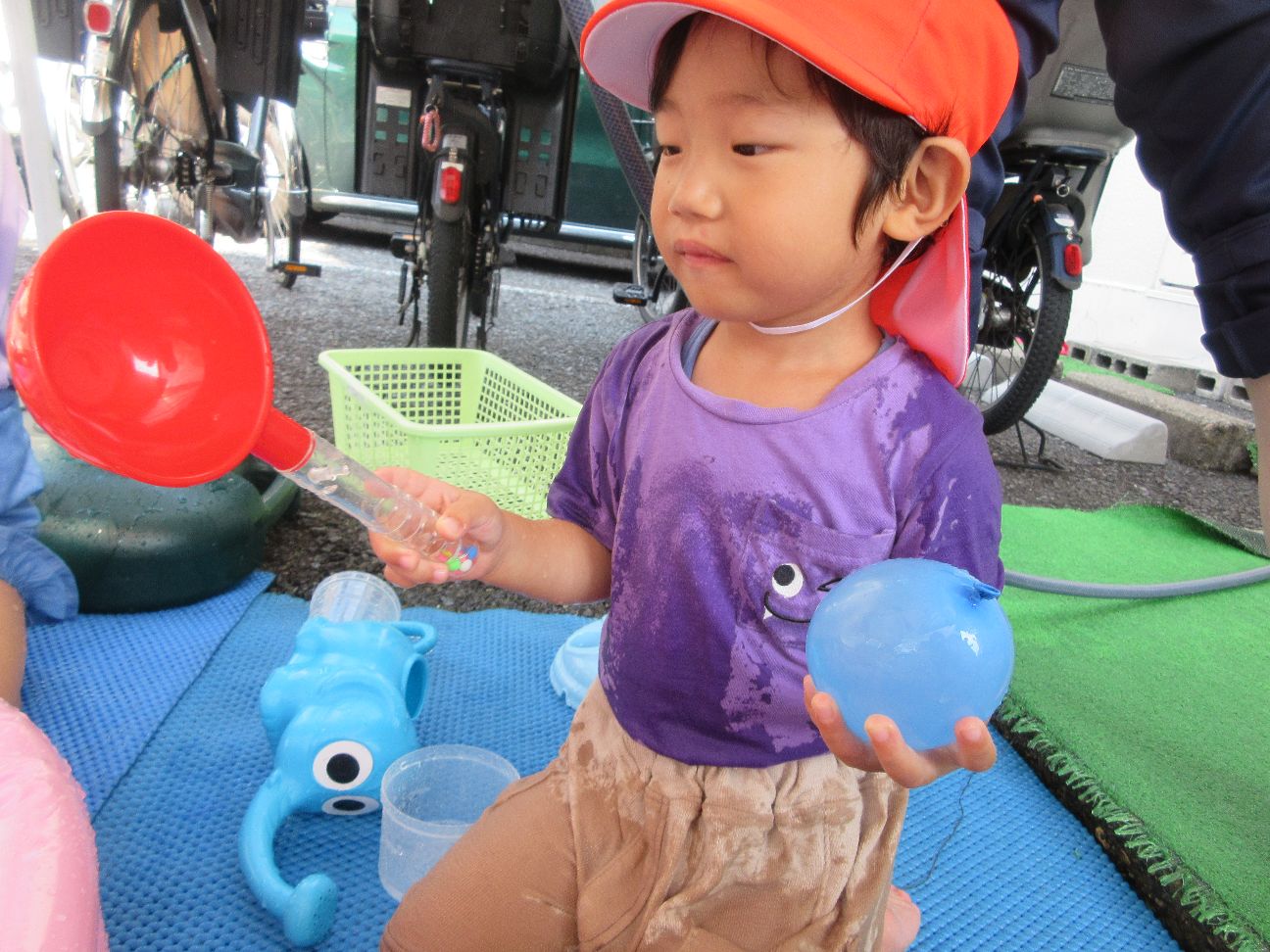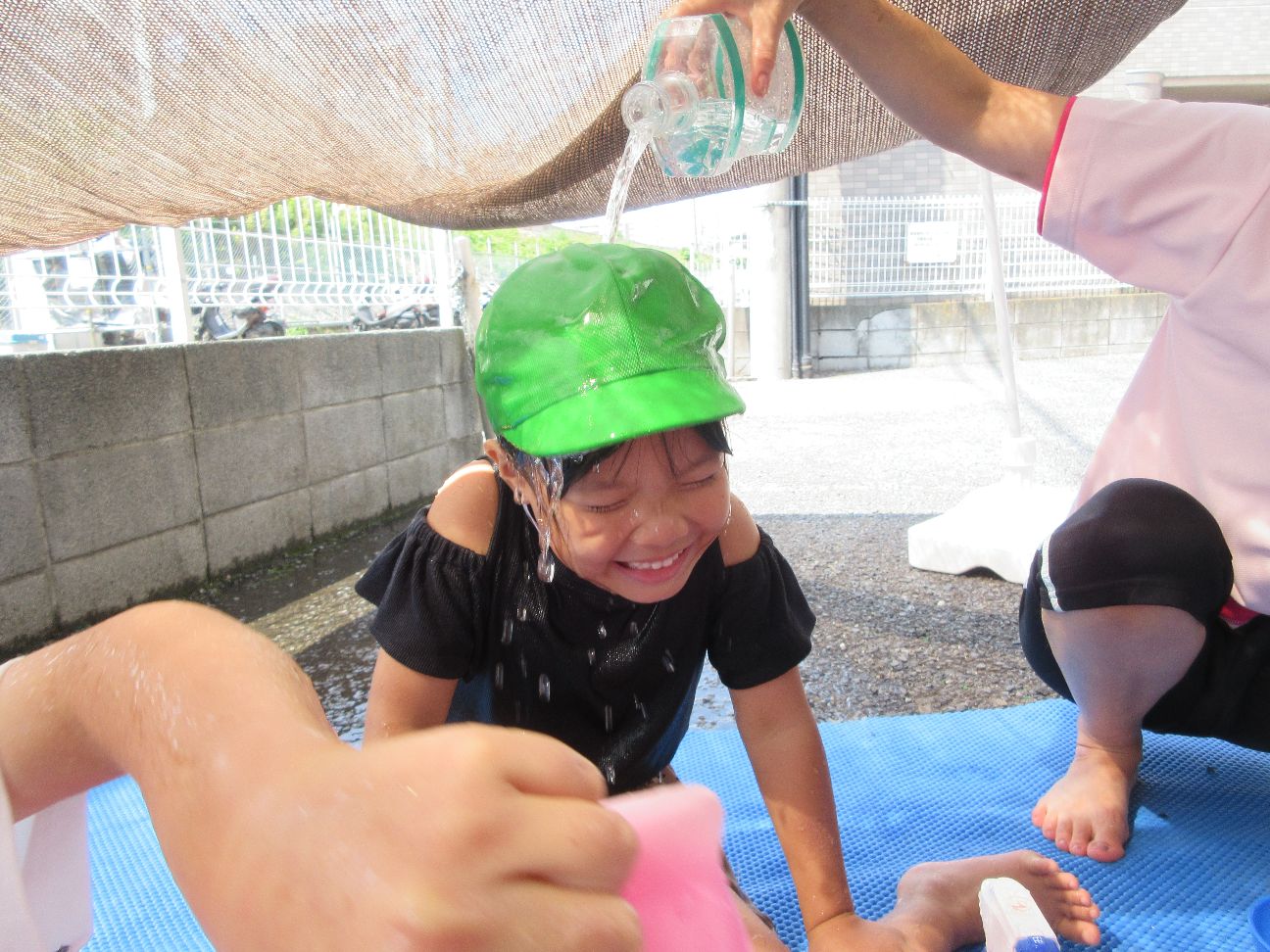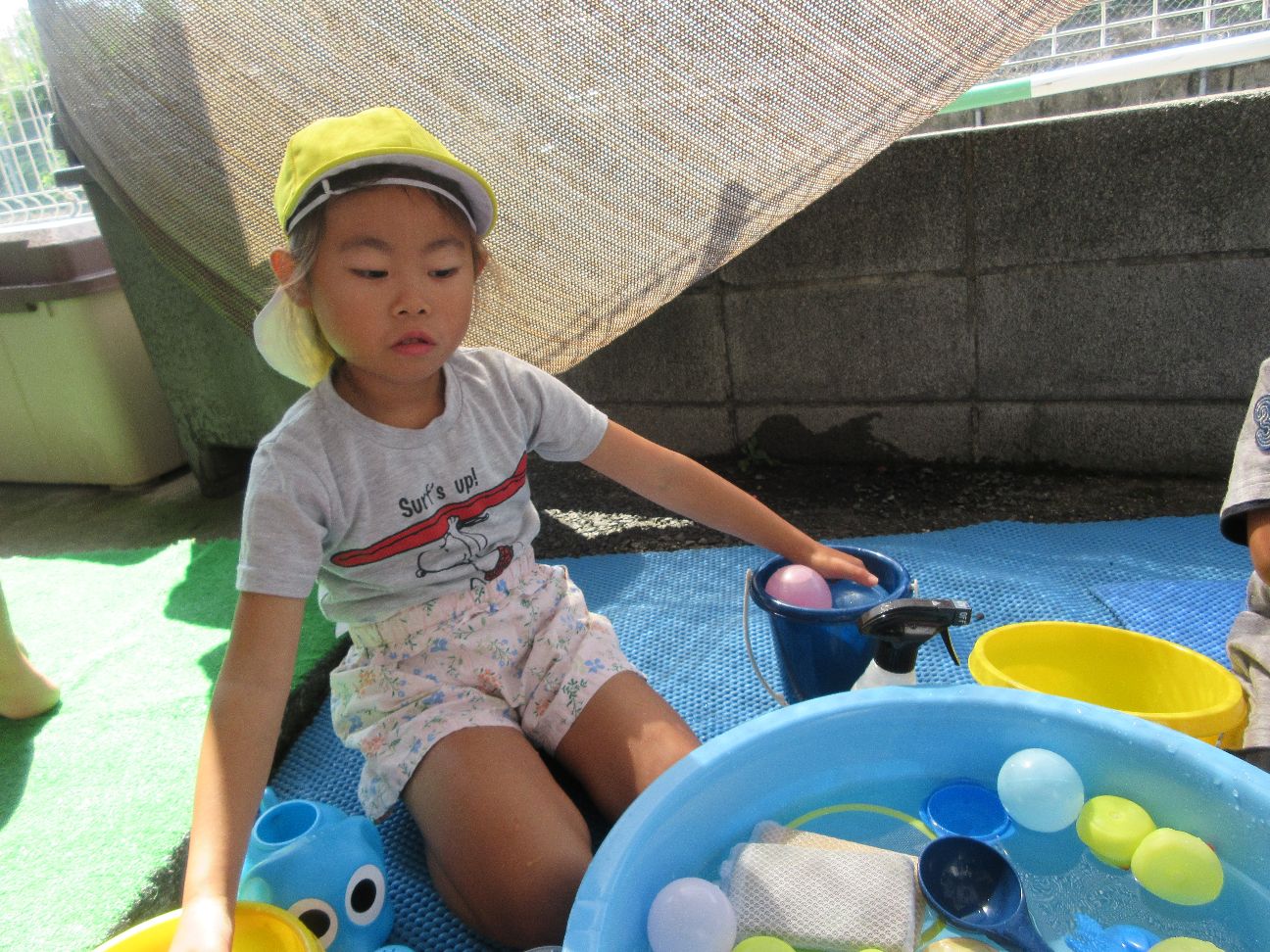 水風船をお玉でキャッチボールのようにして遊んだり、頭から水をかけて遊びました(*^▽^*)