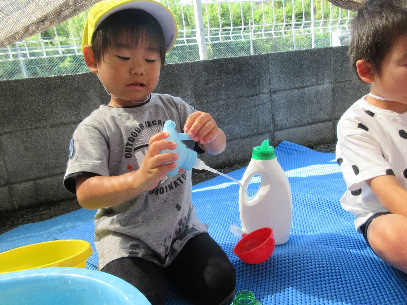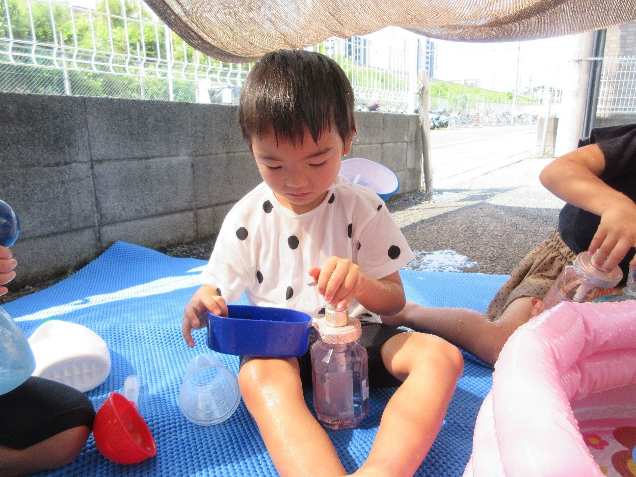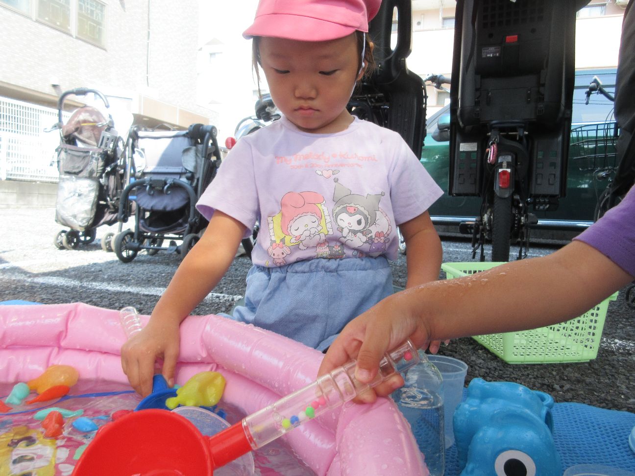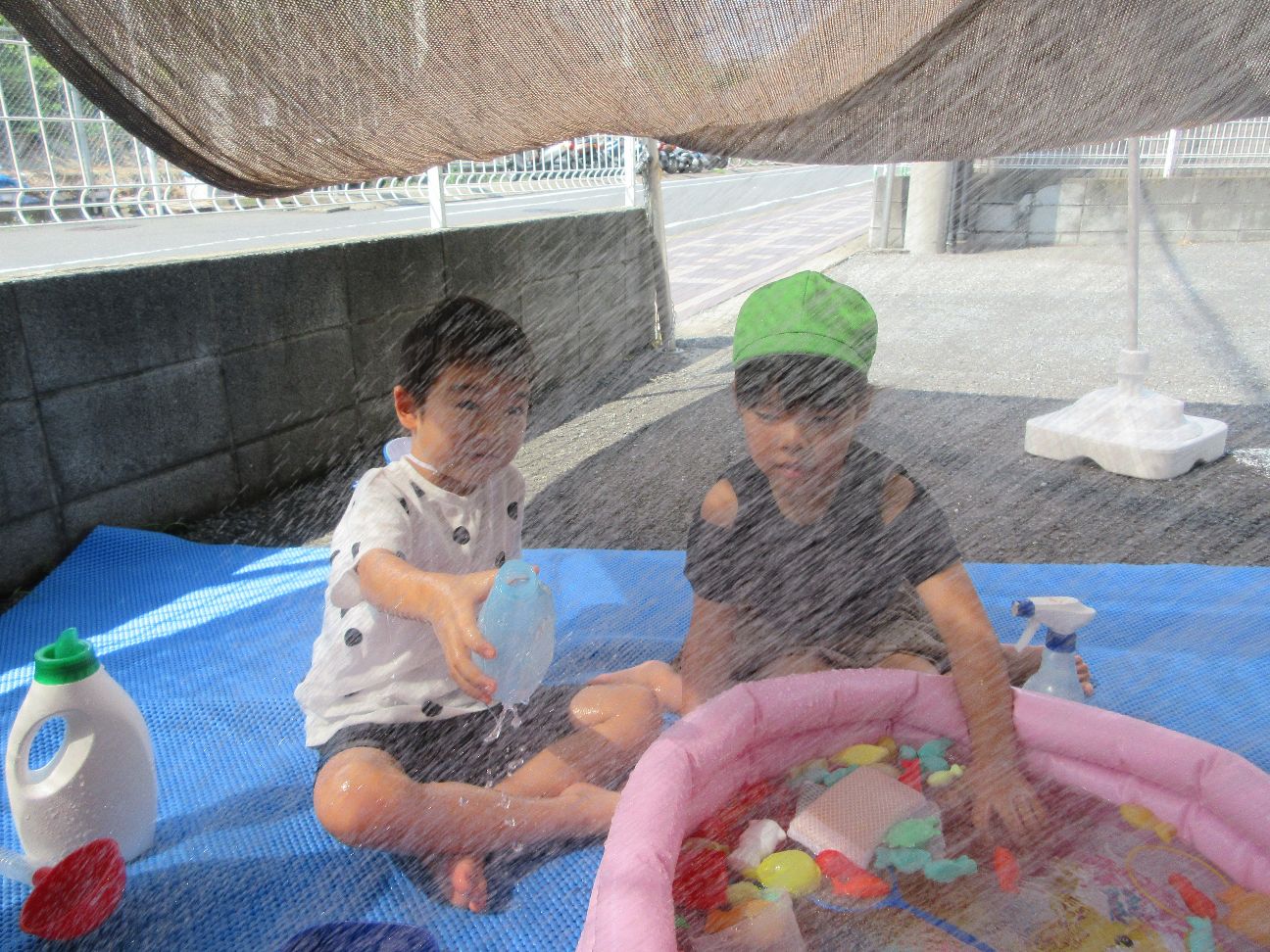 水風船をお玉でキャッチボールのようにして遊んだり、頭から水をかけて遊びました(*^▽^*)