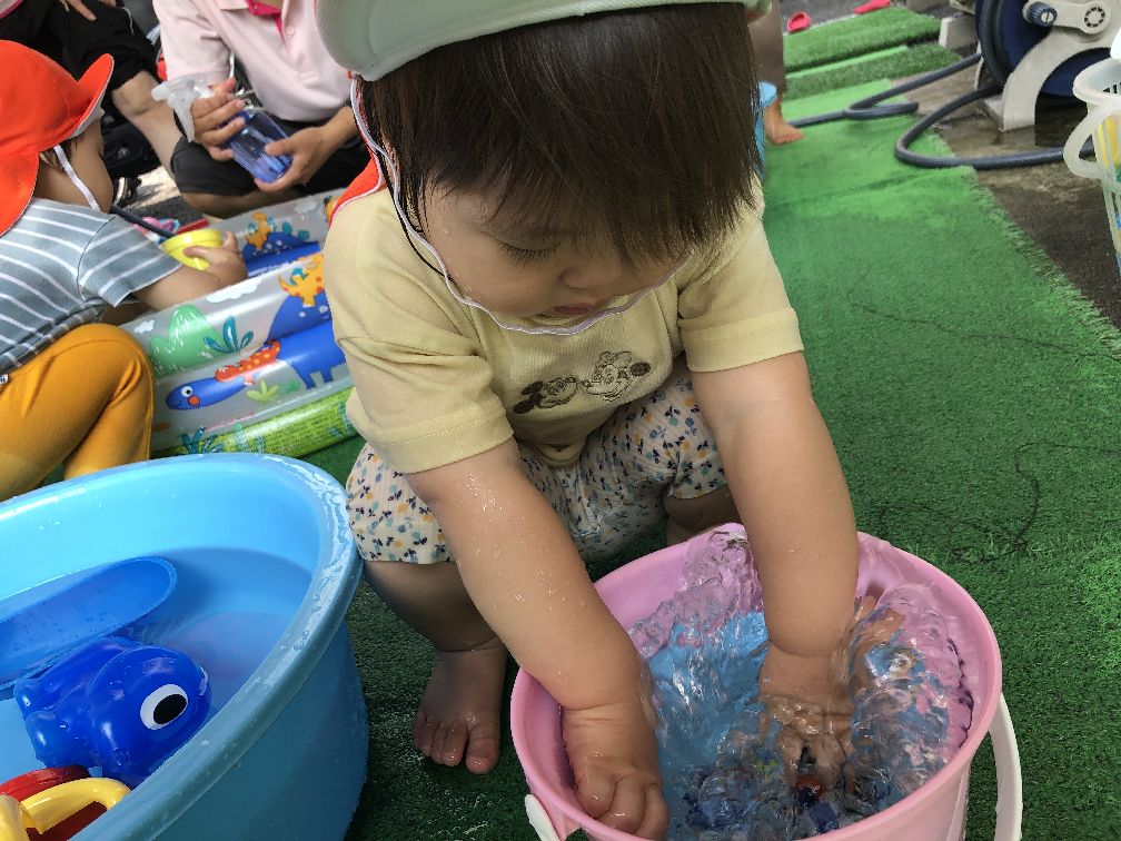 今日も水遊びを行いました。お茶を飲んで帽子をかぶると嬉しそうな子ども達です。