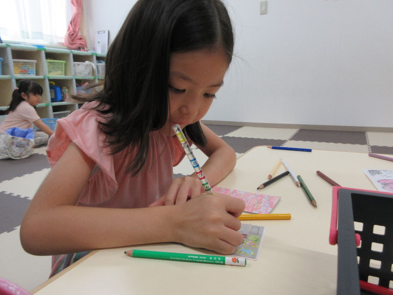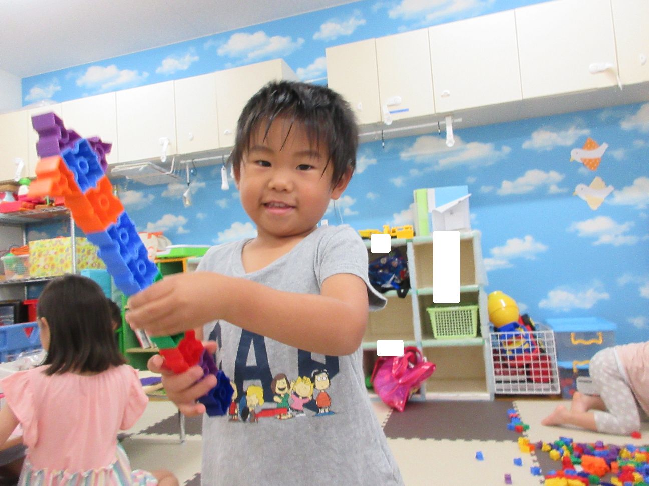 お部屋ではぬいぐるみを広げてお家を作ったり、ぬりえや工作など考えながら工夫して遊んでいます( *´艸`)