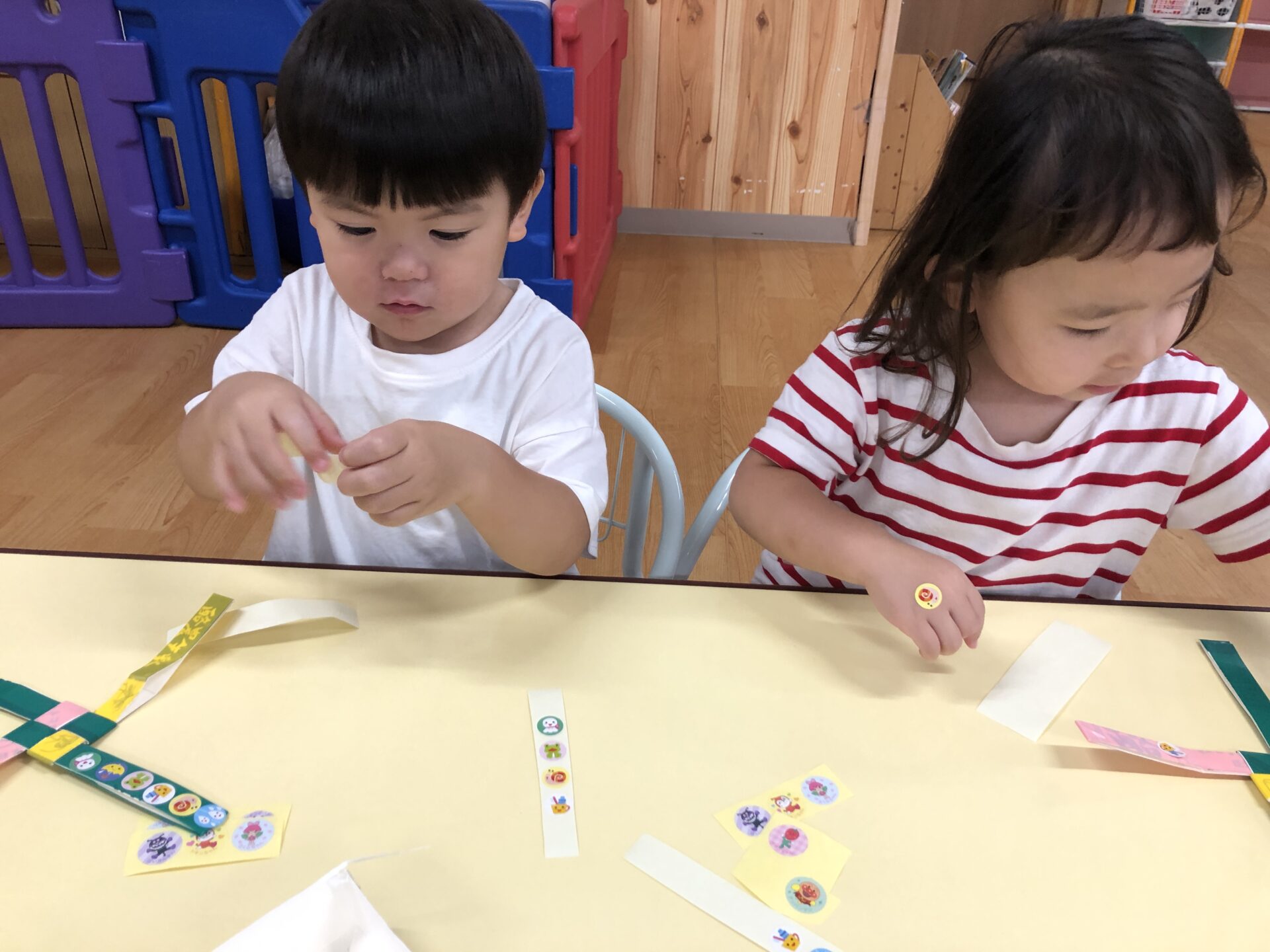シールペタペタ‥コマを作ったよ!あれ!?手に貼っちゃた!