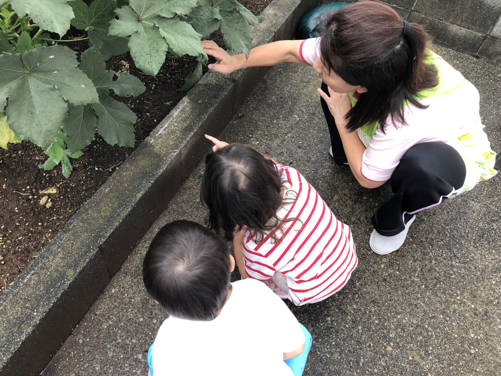 雨が止んでちょっぴり気分転換。大きくなったオクラにビックリ。葉っぱの裏にはアリさん、てんとう虫さん発見❣