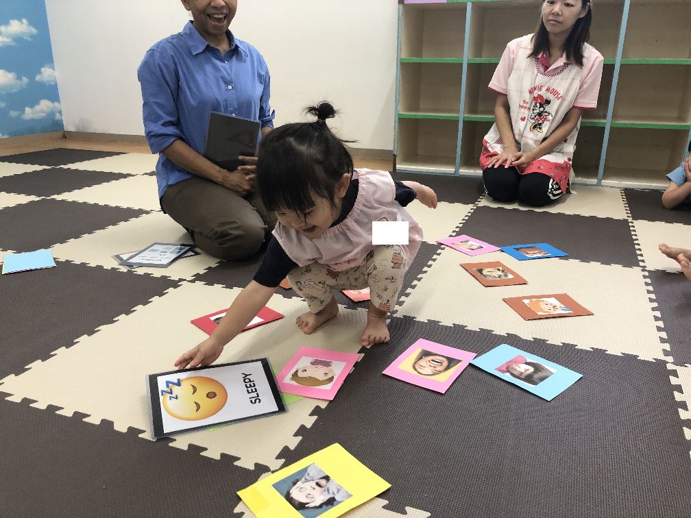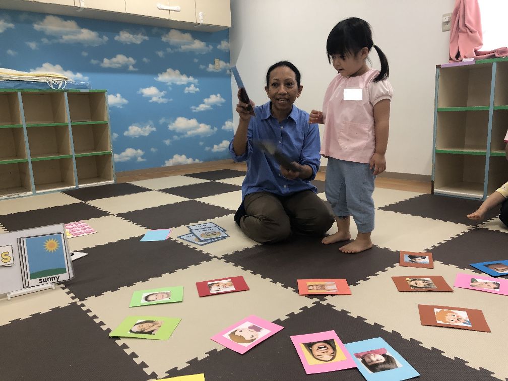 等の表情が描かれたカードを先生が選び、いくつもあるカードの中から同じものを見つけるゲームです🙌