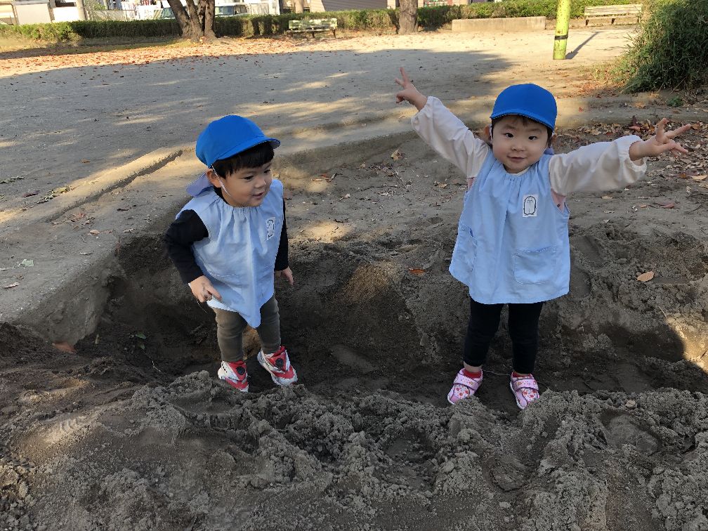 砂場に行くと、大きな穴を発見!!中へ入ってみたよ😆☆