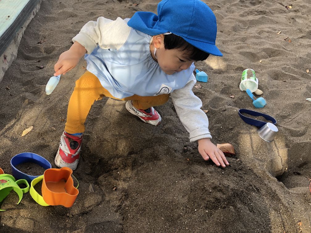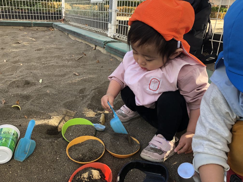 お弁当を作ったり、お皿に砂を入れたり、最後に大きな山も作って遊びました。