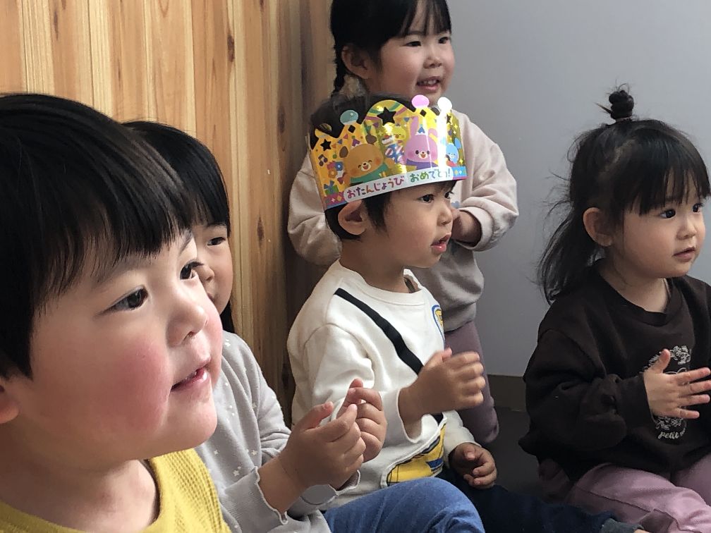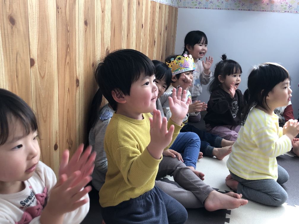 みんなが「おめでとう」とお祝いするととても嬉しそうで先生からの出し物は「はたらくくるま」で歌に合わせてノリノリの子ども達でしたよ。色々な車が出てきて大興奮でした。